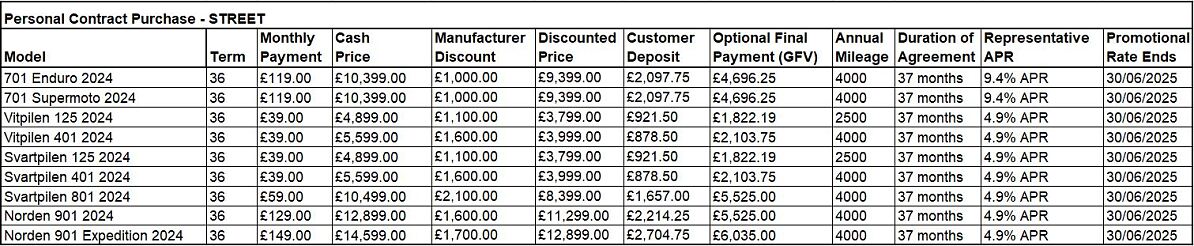 See images attached for the full list of Street and Offroad promotional finance examples.
